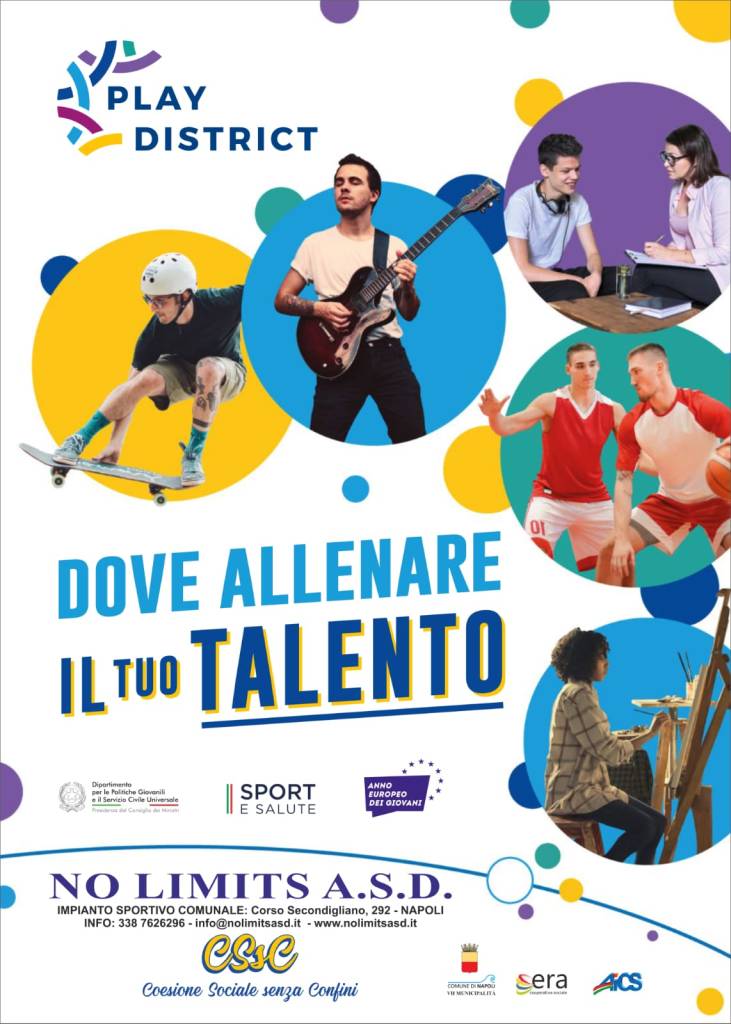 La No Limits A.S.D., con sede nell’Impianto sportivo comunale di Corso Secondigliano – ha dichiarato il presidente Mariateresa Amato – è stata selezionata dal bando Play District di Sport e Salute per la realizzazione del Progetto intitolato Coesione Sociale senza Confini (CSsC). In due anni verranno coinvolti oltre 100 giovani tra i 14 ed i 34 anni, individuati tra i NEET e tra persone con disabilità o in situazione di disagio. Le attività, svolte con la collaborazione dei partner, VII Municipalità, Cooperativa ERA e AICS e con il coinvolgimento dell’Oasi del Bimbo e della Lega Navale di Pozzuoli, prevedono Attività Sportive, Laboratori Artistico-Espressivi, Consulenza Nutrizionale, a cura della Dott.ssa Sonia Negri, Sportello d’Ascolto con la Dott.ssa Annisia Cotena e visite d’idoneità sportiva effettuate dal Medico sportivo Dott. Ranieri Ruzza. L’Associazione, che opera da più di trent’anni nel quartiere in rete con i vari Enti presenti sul Territorio, con questo Progetto si propone come punto di aggregazione sociale giovanile per diventare il primo spazio civico della comunità locale.