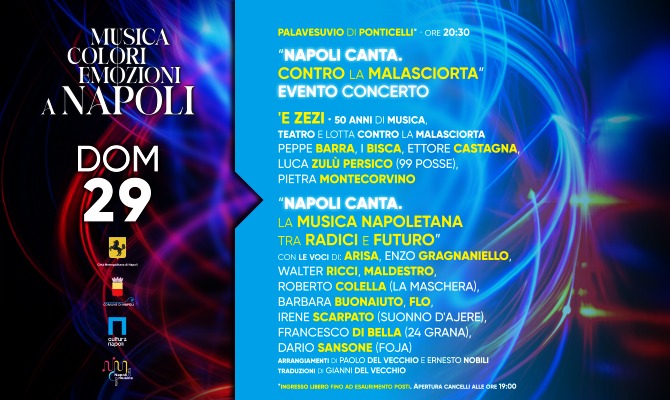 Domenica 29 dicembre, nell’ottica della Napoli policentrica, i quattro giorni di ‘Capodanno a Napoli’ partono da Ponticelli con “Napoli canta contro la malaciorta” al PalaVesuvio con uno show in due parti.