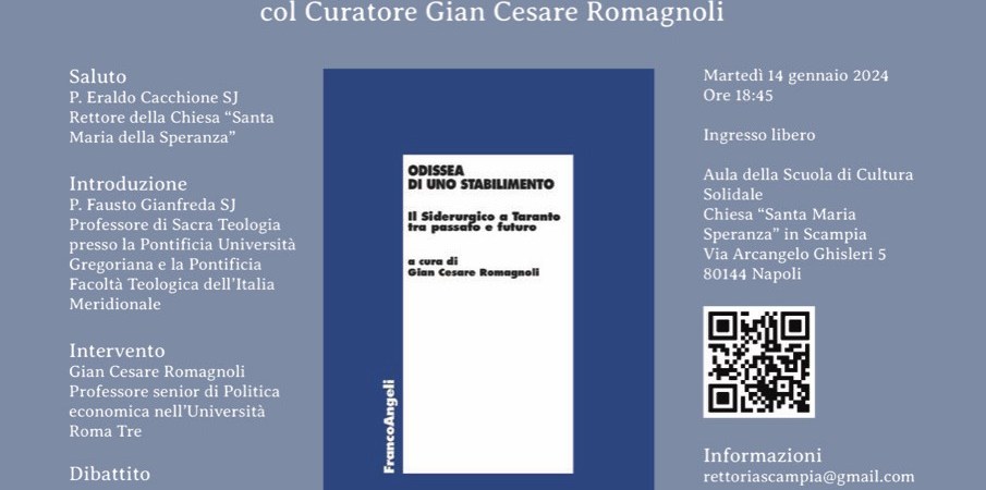 La “Scuola di cultura solidale” di Scampia riprende il suo percorso dopo la pausa natalizia con un appuntamento di particolare rilevanza sociale ed economica. Al centro dell’incontro, fissato per martedì 14 gennaio, alle 18.45, presso l’aula della chiesa di Santa Maria della Speranza a Scampia, la presentazione del volume “Odissea di uno stabilimento. Il Siderurgico a Taranto tra passato e futuro” (Franco Angeli), curato dal Professor Gian Cesare Romagnoli, docente senior di Politica Economica all’Università Roma Tre.