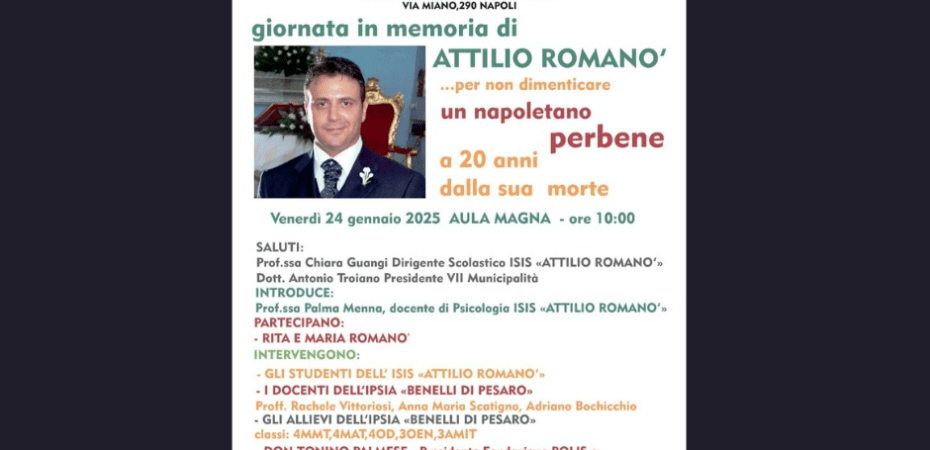 Venerdì 24 gennaio 2025 l’ISIS “Attilio Romanò” di Napoli accoglierà un momento di profonda riflessione e memoria. Nell’Aula Magna dell’istituto di via Miano si terrà, infatti, una giornata commemorativa dedicata ad Attilio Romanò, vittima innocente della camorra, a vent’anni dalla sua tragica scomparsa.