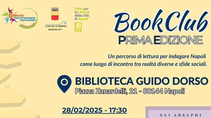 L’ Associazione Oratorio San Francesco Caracciolo organizza un nuovo appuntamento del BookClub presso la Biblioteca Guido Dorso di Secondigliano. L’incontro, fissato per venerdì 28 febbraio alle 17:30, sarà dedicato all’analisi e alla discussione del celebre “Il mare non bagna Napoli” di Anna Maria Ortese.