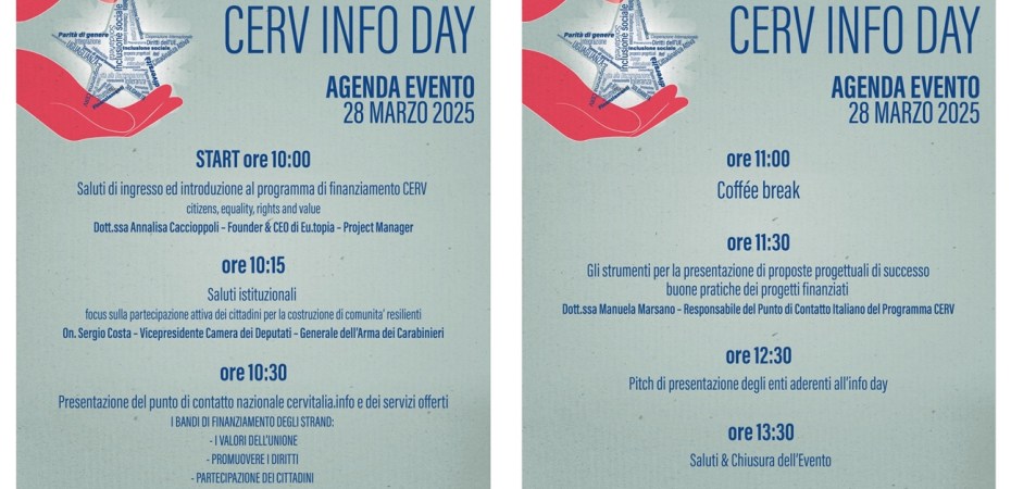 Il 28 marzo 2025 si terrà a Napoli un importante evento dedicato al Programma CERV (Citizens, Equality, Rights and Values), l’iniziativa europea che promuove la partecipazione democratica e i diritti fondamentali dei cittadini.
