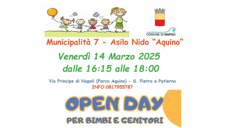 L’Asilo Nido “Aquino“, struttura educativa della Municipalità 7 del Comune di Napoli, annuncia l’organizzazione di un importante evento dedicato alle famiglie del territorio: il suo Open Day. L’appuntamento, programmato per venerdì 14 marzo 2025, si svolgerà nel pomeriggio dalle ore 16:15 alle 18:00, offrendo un’ampia finestra temporale per accogliere tutti gli interessati.