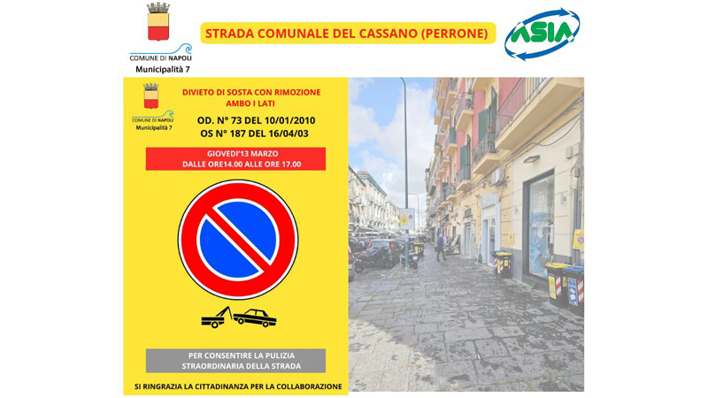 Importante intervento di pulizia straordinaria in programma per giovedì 13 marzo nella zona di Secondigliano. L’Asia, in collaborazione con la Municipalità 7, effettuerà uno spazzamento meccanico lungo la Strada Comunale del Cassano, meglio nota come Perrone, nel tratto compreso tra l’incrocio con corso Secondigliano, vico Maglione e via Luigi Parascandolo, includendo via Tiberio Cavallo.