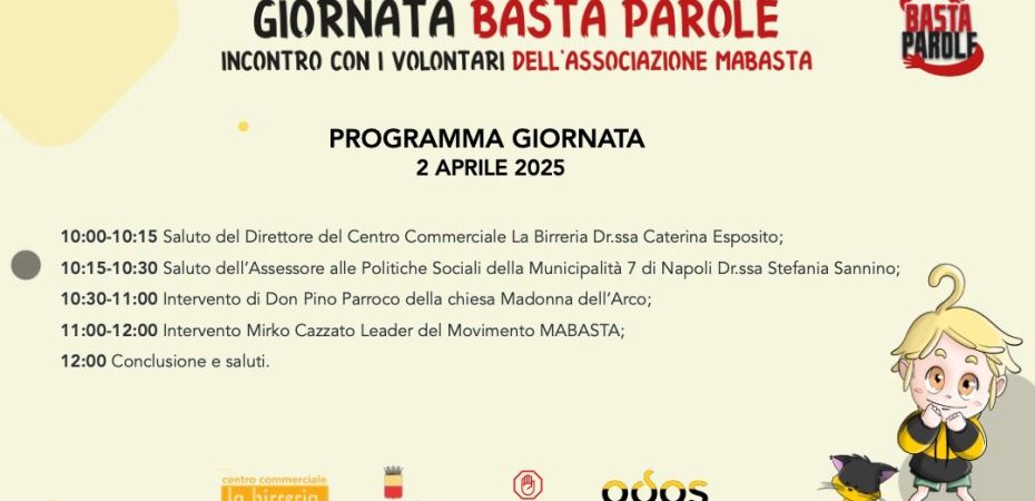 A concludere il progetto, ci sarà poi proprio “La giornata BASTAPAROLE” il giorno 2 aprile in cui tutti gli alunni che hanno preso parte al progetto e non, si ritroveranno al centro commerciale “La Birreria” e vivranno tutti insieme una giornata di confronto sul tema: la giornata prevede l’incontro con i volontari del movimento MABASTA, che presenteranno nel dettaglio le sei azioni del loro modello e approfondiranno gli aspetti legati ai fenomeni del bullismo e del cyberbullismo. Inoltre, i volontari mostreranno agli alunni gli strumenti per affrontare e prevenire l’insorgere del problema. La presenza delle autorità Locali, Regionali e delle Forze dell’Ordine, sanciranno la volontà delle Istituzioni ad affrontare il problema, e tracciare tutti insieme un percorso che conduca il territorio al rispettoso delle regole e che lo renda più sicuro.