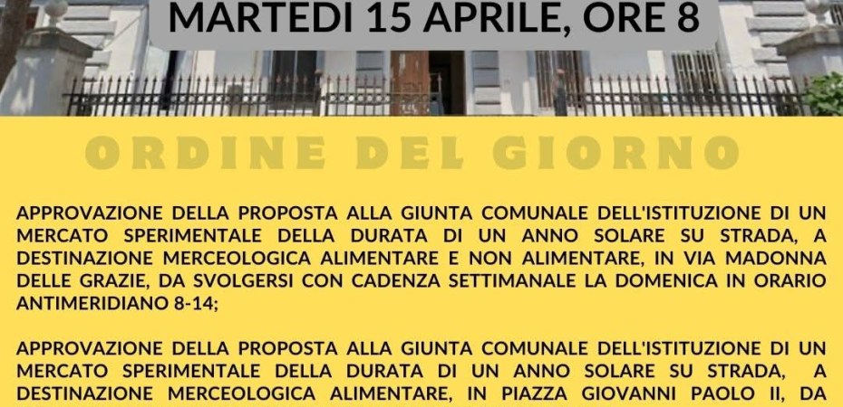 All’ordine del giorno l’approvazione della proposta per un mercato sperimentale in Via Madonna delle Grazie, con cadenza settimanale domenicale dalle 8:00 alle 14:00. Il mercato sarà destinato alla vendita di prodotti merceologici sia alimentari che non alimentari.