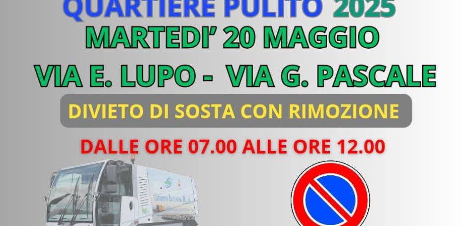La Municipalità 7 di Napoli prosegue con determinazione il programma di pulizia straordinaria delle strade cittadine denominato “Quartiere Pulito”. Il prossimo intervento è programmato per martedì 20 maggio 2025 e interesserà via Ettore Lupo e via Giovanni Pascale, a San Pietro a Patierno.