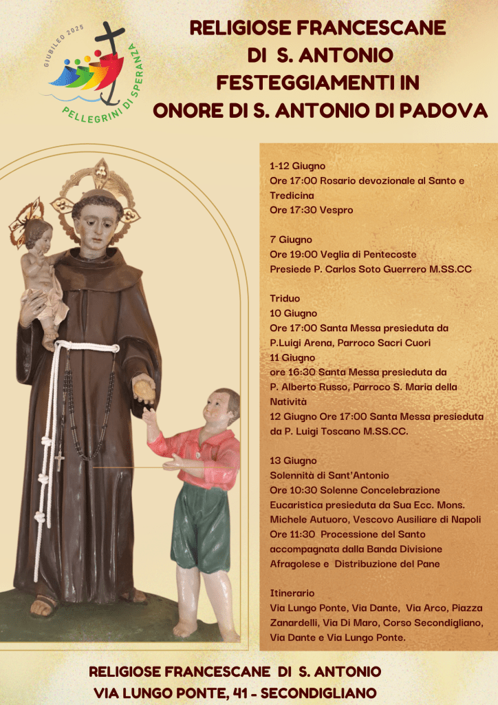 Le Religiose Francescane di Sant’Antonio annunciano con gioia i festeggiamenti in onore di Sant’Antonio di Padova, che si terranno dal 1 al 13 giugno presso la loro sede in via Lungo Ponte, 41, a Secondigliano.