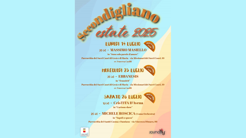 Sulla scia del successo di “Secondigliano canta il Natale”, l’assessorato al Turismo del Comune di Napoli, in collaborazione con l’agenzia Soundfly, presenta una nuova iniziativa culturale: “Secondigliano Estate 2025”. Il progetto, fortemente voluto dal consigliere comunale PD Pasquale Esposito, porta spettacoli di alta qualità nei cortili delle parrocchie del quartiere, trasformandoli in palcoscenici di aggregazione e cultura.