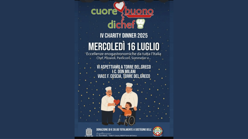 L’appuntamento è per il 16 luglio 2025 alle ore 20:00 nell’area esterna dell’I.C. Don Milani (plesso D. Parrella) in Viale F. Coscia a Torre del Greco. Con una donazione di 30€, i partecipanti potranno degustare le specialità preparate da 64 professionisti del settore gastronomico, tra cui chef stellati, maestri pizzaioli e rinomati pasticceri.
