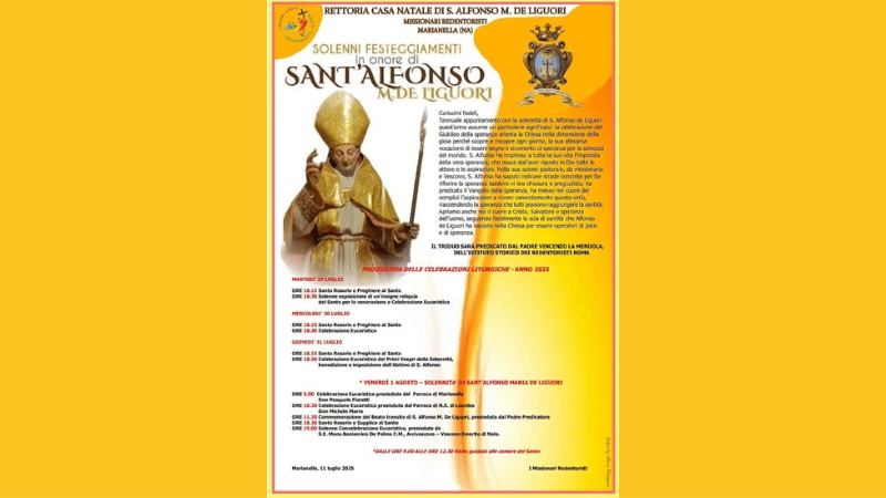 Il triduo sarà predicato dal Padre Vincenzo La Mendola dell’Istituto Storico dei Redentoristi di Roma, che guiderà i fedeli nella riscoperta del messaggio di speranza lasciato da Sant’Alfonso, particolarmente attuale nel contesto del Giubileo.