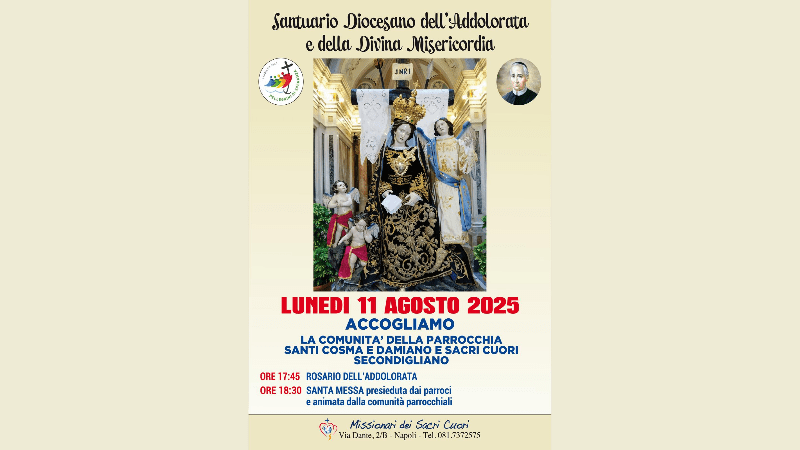 Lunedì 11 agosto il Santuario Diocesano dell’Addolorata e della Divina Misericordia, nel cuore di Secondigliano, accoglierà con gioia la comunità parrocchiale dei Santi Cosma e Damiano e Sacri Cuori di Secondigliano, in occasione del Giubileo 2025 dei Pellegrini di Speranza.