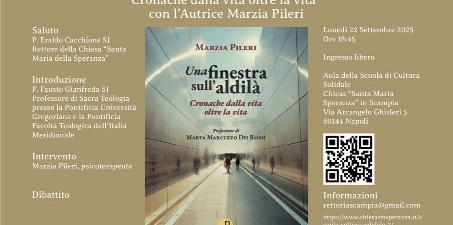 Il prossimo incontro è fissato per lunedì 22 settembre alle ore 18:45, presso la Chiesa di Santa Maria Speranza. Al centro della serata ci sarà la presentazione del libro “Una finestra sull’aldilà. Cronache dalla vita oltre la vita” (La Parola, 2025), alla presenza dell’autrice Marzia Pileri, psicoterapeuta e insegnante di Meditazione Profonda.