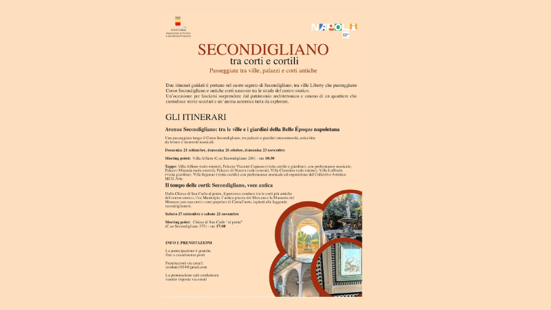 Il primo itinerario, intitolato “Avenue Secondigliano: tra le ville e i giardini della Belle Époque napoletana”, propone una passeggiata lungo il corso principale del quartiere. Il percorso toccherà alcune delle ville e dei palazzi più significativi, con aperture straordinarie di cortili e giardini, arricchite da performance musicali e letture.