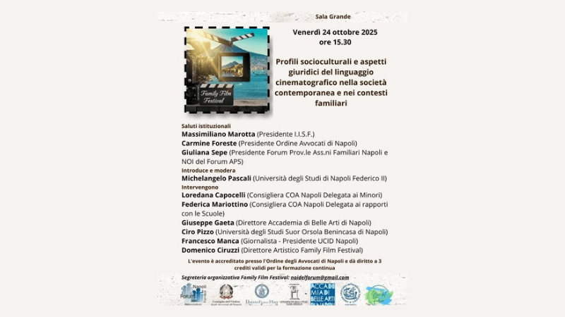 Un nuovo appuntamento del Family Film Festival, promosso da Noi del Forum APS, si terrà venerdì 24 ottobre 2025 alle ore 15.30 presso il prestigioso Palazzo Serra di Cassano, sede dell’Istituto Italiano per gli Studi Filosofici in via Monte di Dio 14, Napoli.