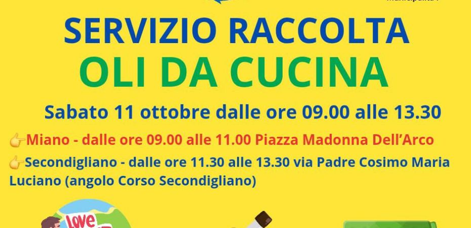 Prosegue l’iniziativa promossa da ASIA Napoli e dalla Municipalità 7 per incentivare la corretta raccolta e il riciclo dell’olio da cucina esausto. Sabato 11 ottobre sarà possibile conferire l’olio domestico usato presso due punti di raccolta itinerante: dalle 9.00 alle 11.00 in piazza Madonna dell’Arco a Miano (lato parcheggio della chiesa) e dalle 11.30 alle 13.30 in via Padre Cosimo Luciano, all’angolo con corso Secondigliano.