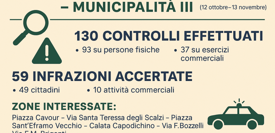 Nel territorio della III Municipalità Stella–San Carlo all’Arena proseguono senza sosta i controlli della polizia locale sul corretto conferimento dei rifiuti da parte di cittadini ed esercizi commerciali. Nel solo periodo compreso tra il 12 ottobre e il 13 novembre sono state accertate cinquantanove infrazioni.