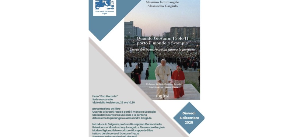 Giovedì 4 dicembre, alle 10.30, presso il Liceo Statale “Elsa Morante” di Scampia, diretto dalla dirigente scolastica Giuseppina Marzocchella, si terrà una nuova presentazione del volume “Quando Giovanni Paolo II portò il mondo a Scampia. Storia dell’incontro tra un santo e la periferia”, scritto dal giornalista Massimo Iaquinangelo e dal parroco di Maria Santissima del Buon Rimedio Alessandro Gargiulo, pubblicato da Rogiosi Editore. L’iniziativa segue il recente appuntamento ospitato nella Parrocchia Maria SS. del Buon Rimedio, che ha registrato un’ampia partecipazione di fedeli e interessati alla memoria storica del territorio.