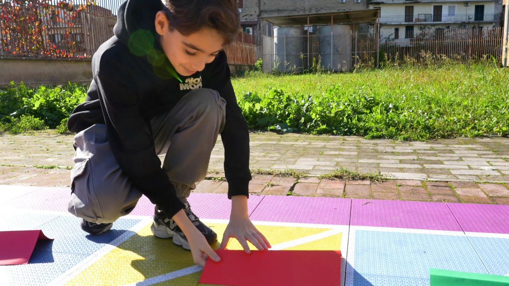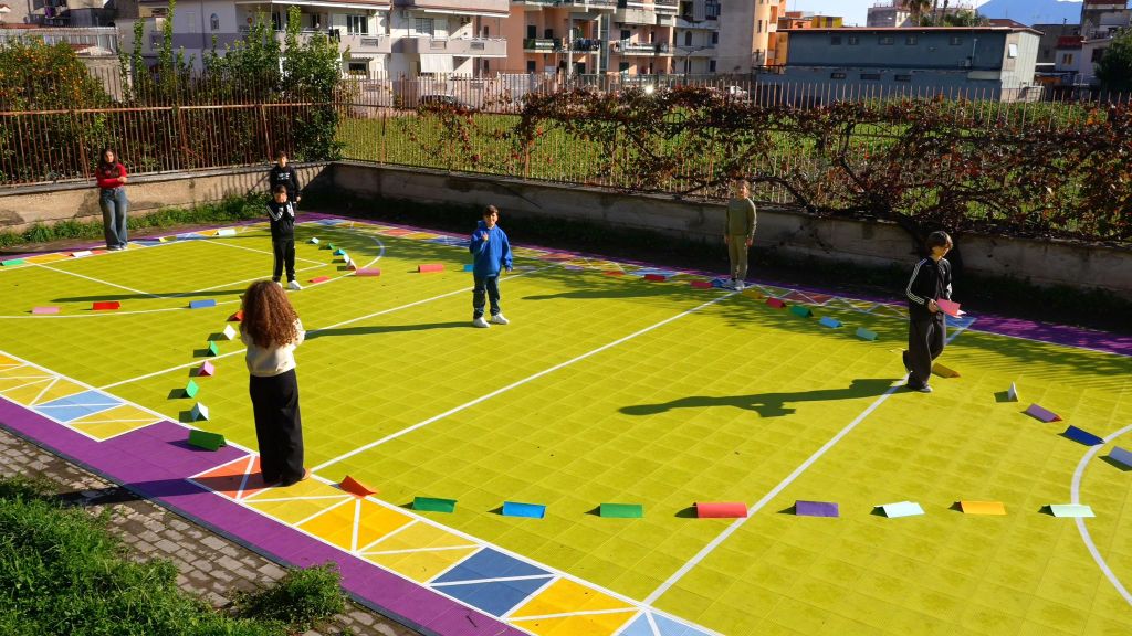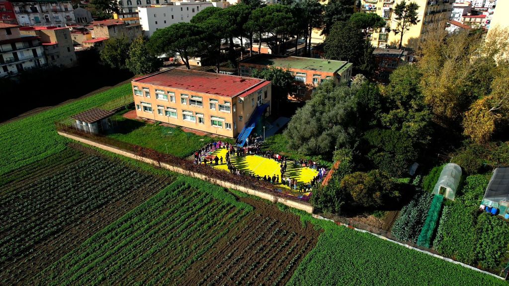 La performance è stata curata dagli ambasciatori Rebirth/Terzo Paradiso Chatrin Ponticelli e Luigi Di Criscio, che hanno guidato i ragazzi nella realizzazione del segno trinamico ideato da Michelangelo Pistoletto. Sul campo della scuola, solitamente destinato al gioco e allo sport, il simbolo è stato tracciato a terra e reso “vivente” grazie al movimento degli studenti, chiamati non solo a guardare ma ad attraversarlo fisicamente, trasformando ogni passo in un gesto consapevole.