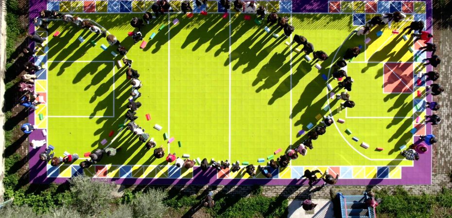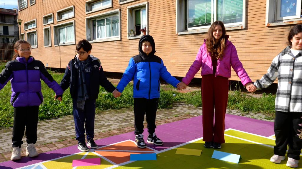 Sei alunni hanno rappresentato i punti cardine della forma, mentre gli altri hanno camminato in fila lungo il tracciato, componendo progressivamente il simbolo. In questo modo, il Terzo Paradiso ha smesso di essere un’immagine astratta per diventare esperienza concreta, fatta di corpi, tempi e relazioni, capace di rendere visibile il valore dell’azione collettiva.