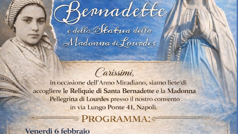 Secondigliano si prepara a vivere un momento di intensa spiritualità con la Peregrinatio delle reliquie di Santa Bernadette e della statua della Madonna di Lourdes, ospitate presso il convento delle Religiose Francescane di Sant’Antonio, in via Lungo Ponte 41. Un appuntamento inserito nel cammino dell’Anno Miradiano, che richiama fedeli, famiglie e associazioni del territorio.