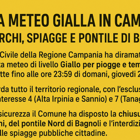 Allerta meteo gialla in Campania: chiusi parchi, spiagge e pontile di Bagnoli